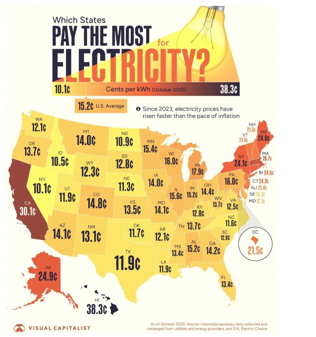 Which states pay the most for electricity?